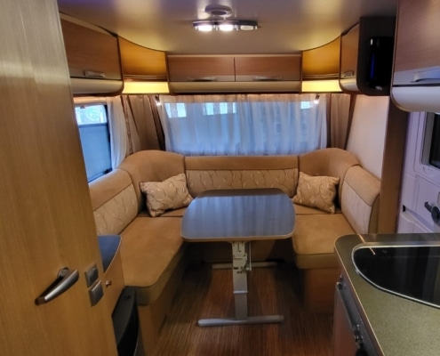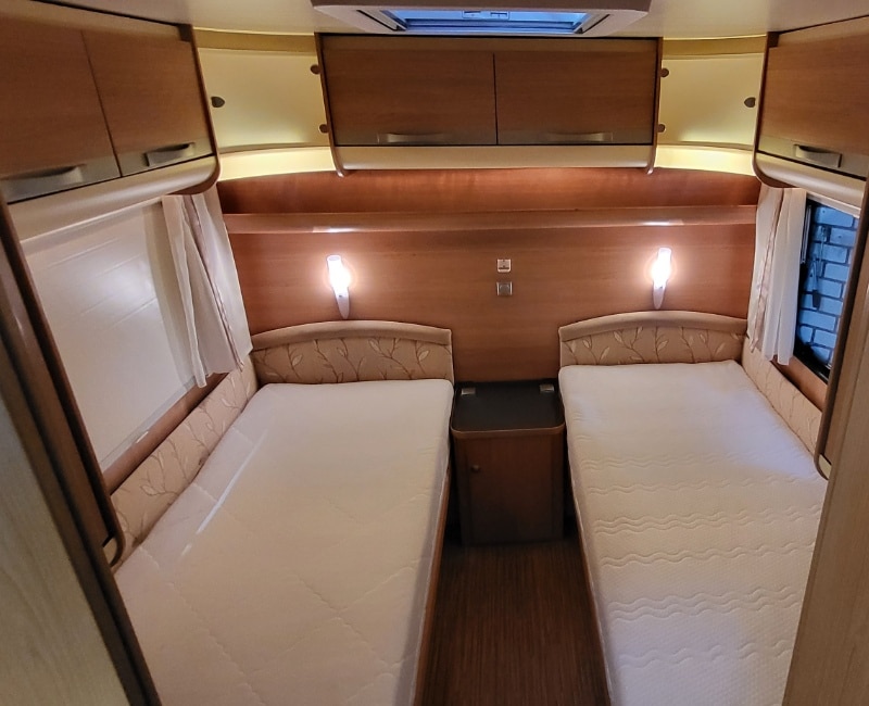 Mooie caravan met 2 enkele bedden en een rondzit.