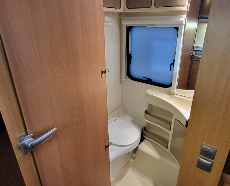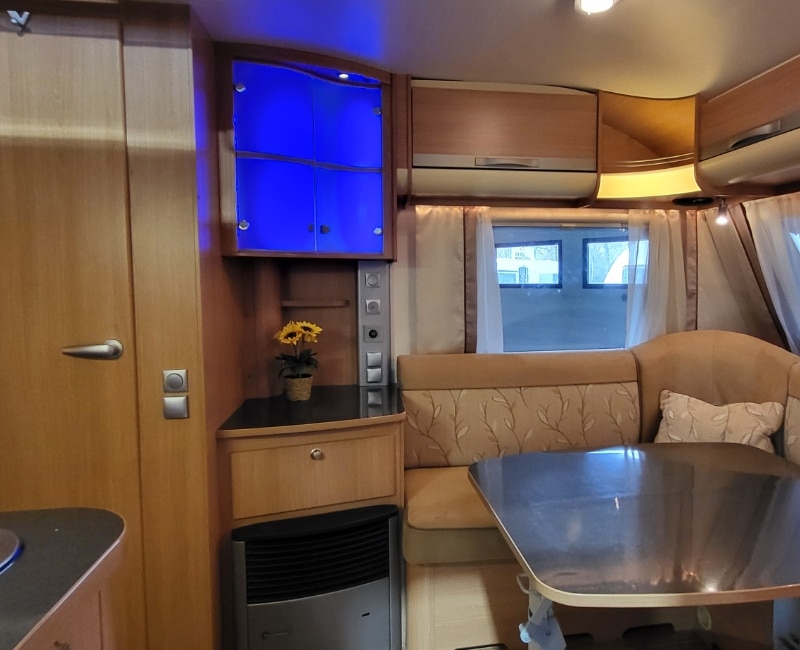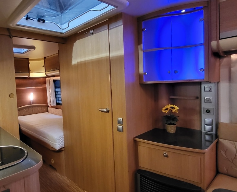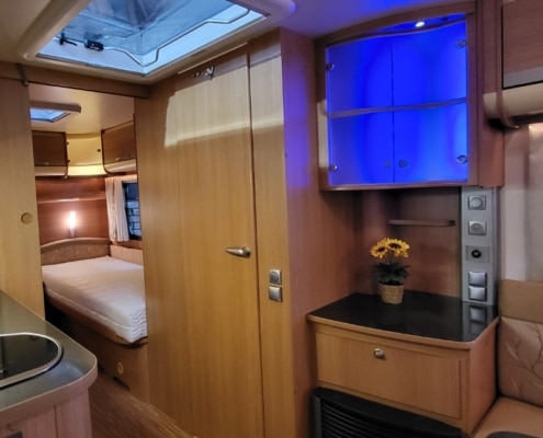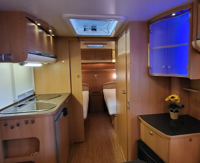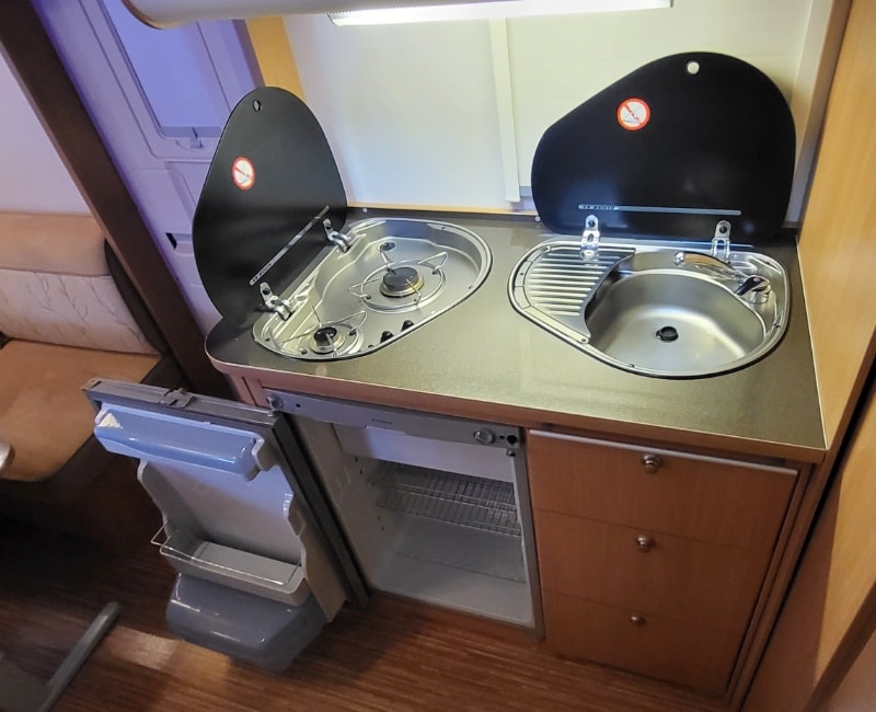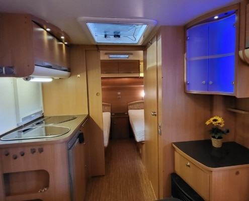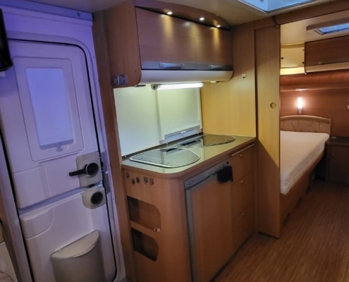 Sanitair voorziening en keuken bevindt zich in het midden van de caravan.