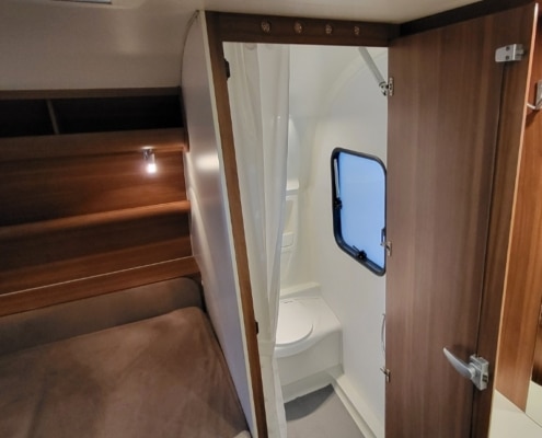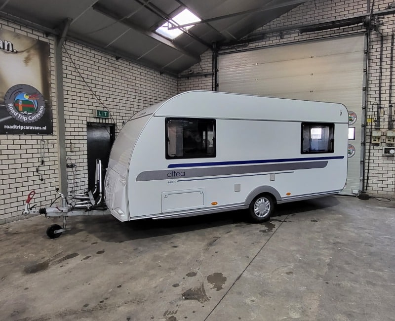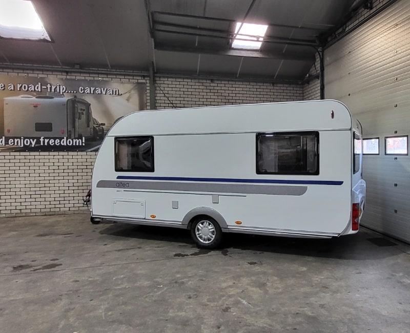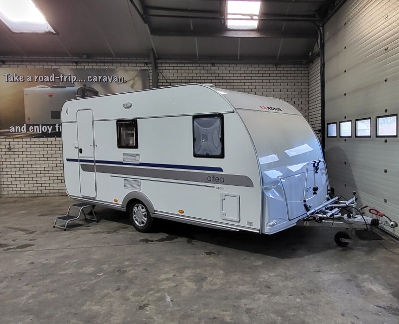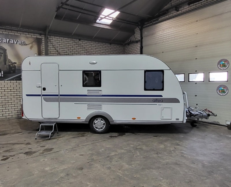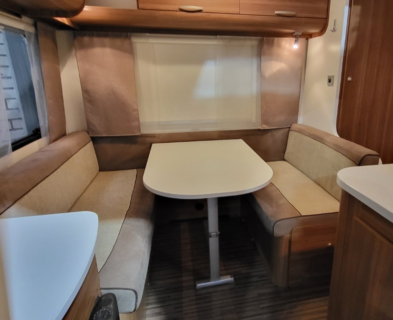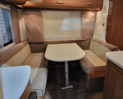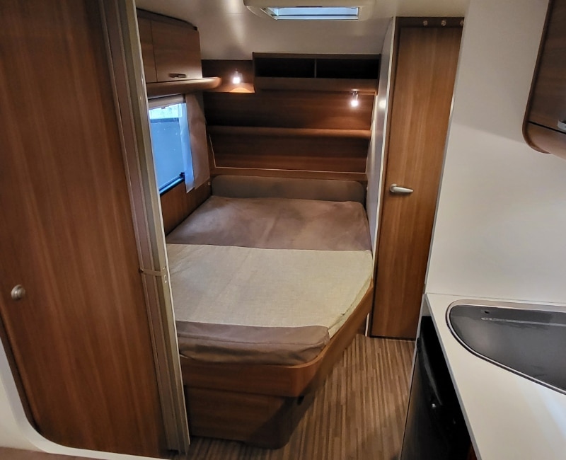 De indeling van deze caravan is voorin een Frans bed en achterin een treinzit.
