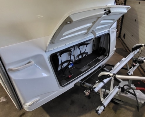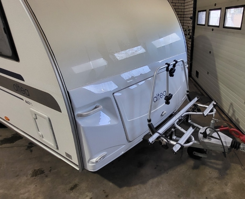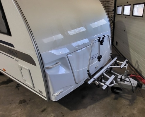 Voorop de dissel bevindt zich een Thule fietsendrager (Max. 60 kg).