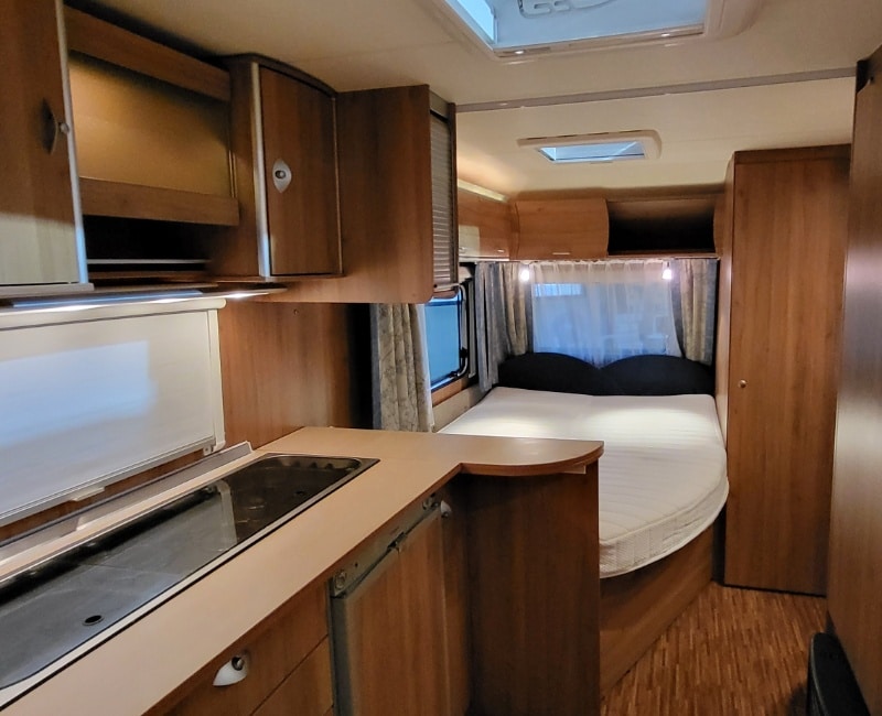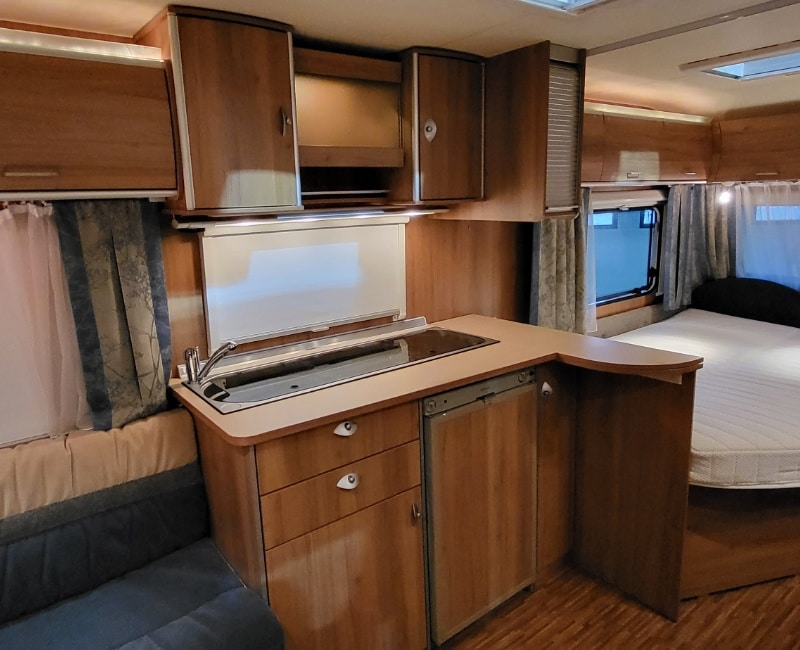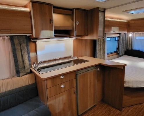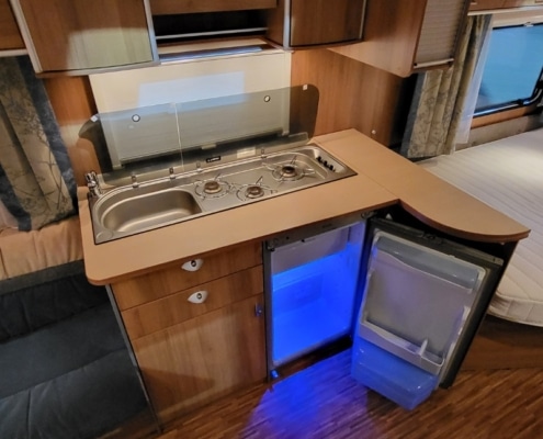 In het midden van de caravan bevindt zich de keuken met een koelkast met vriesvak en een kookstel met 3- gaspitten.