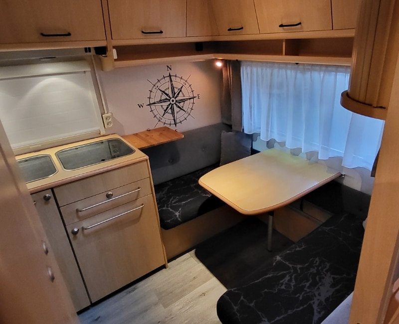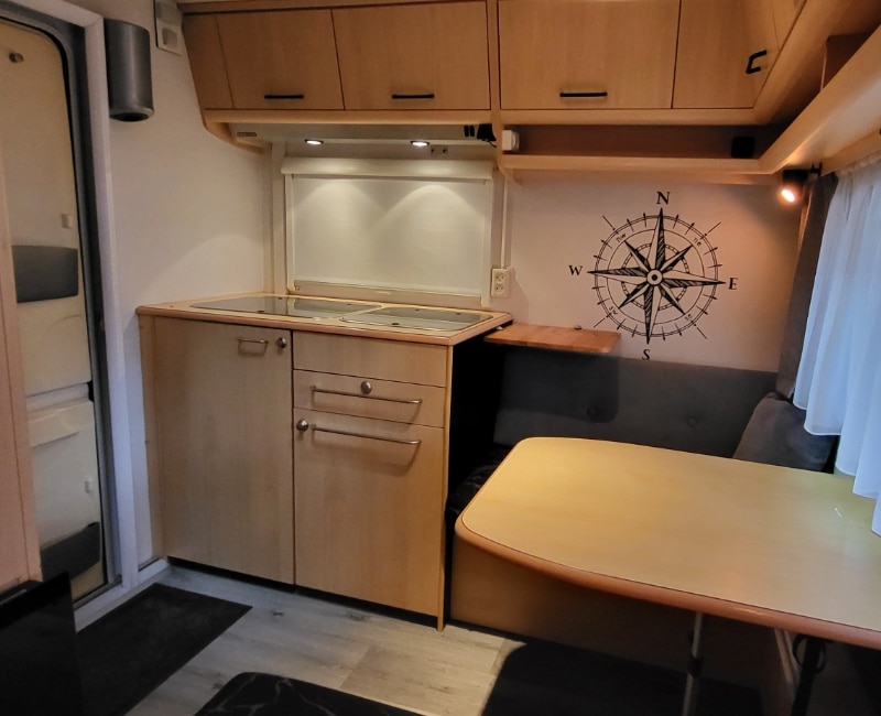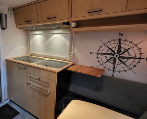 Achterin bevindt zich een treinzit en een keuken die voorzien is van een koelkast/vriesvak en een gasstel en spoelbak.