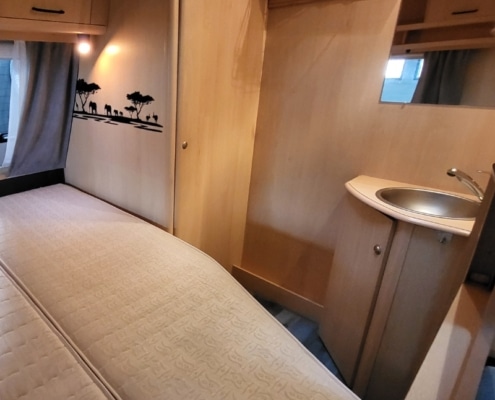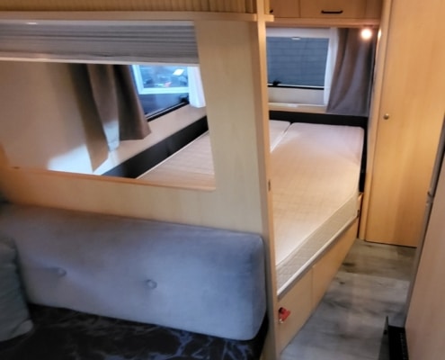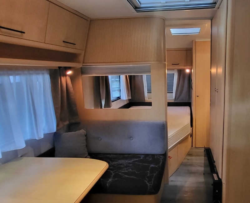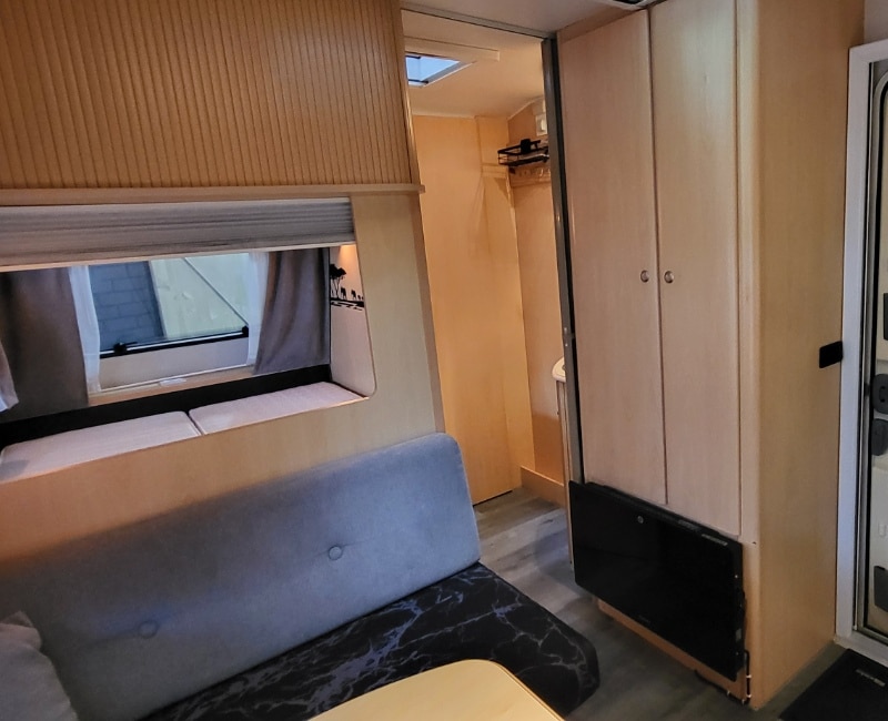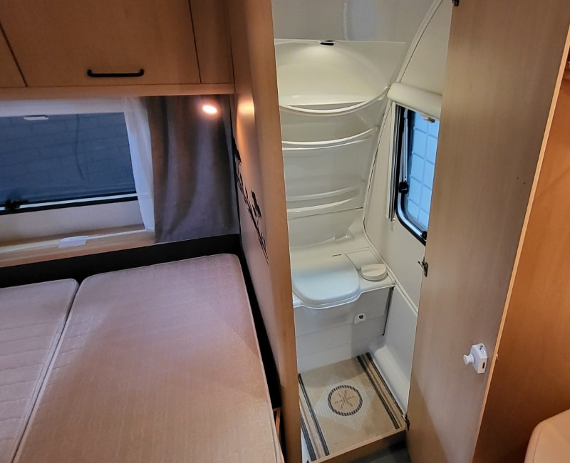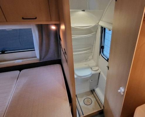 De indeling van deze caravan is zeer praktisch en bestaat uit een Frans bed voorin en een toilet/wasruimte ernaast.