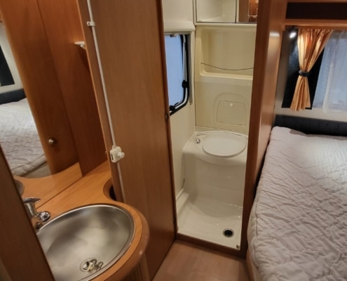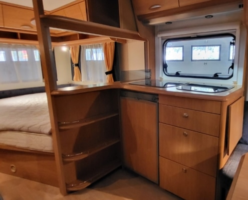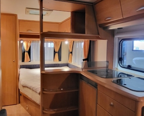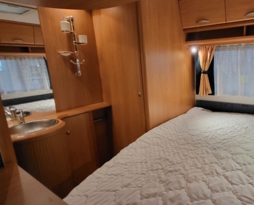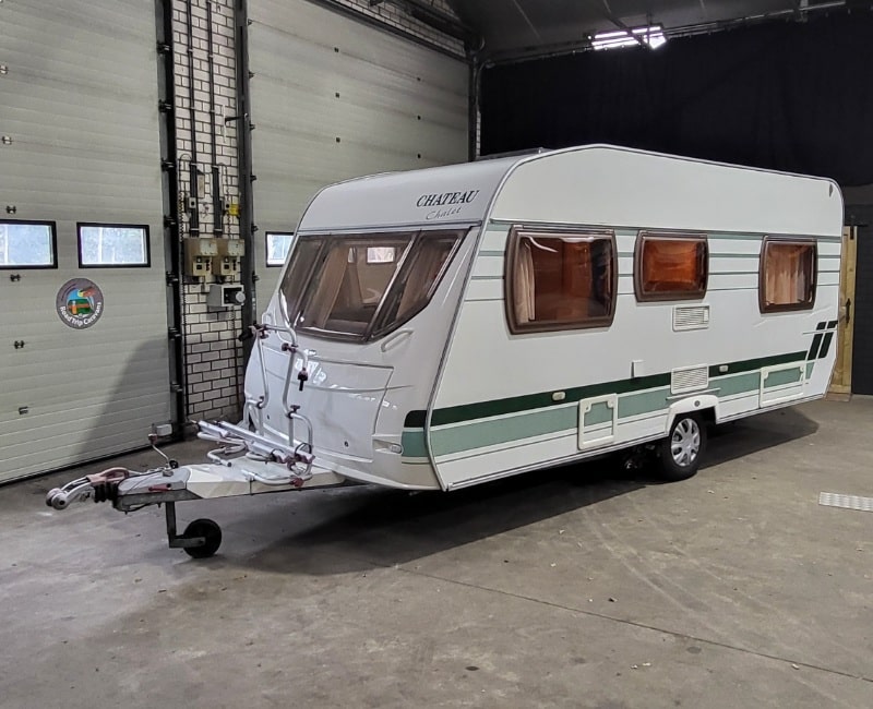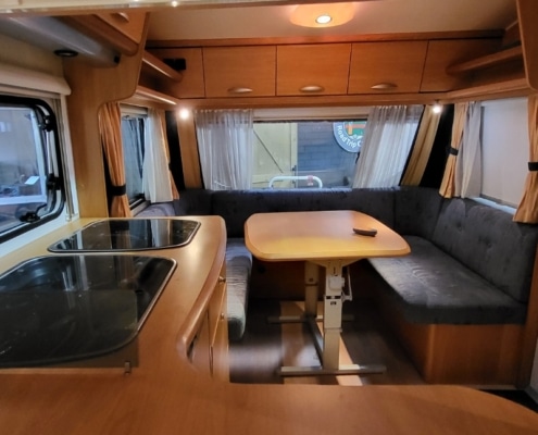 Chateau caravan met achterin een Frans bed en voorin een rondzit.