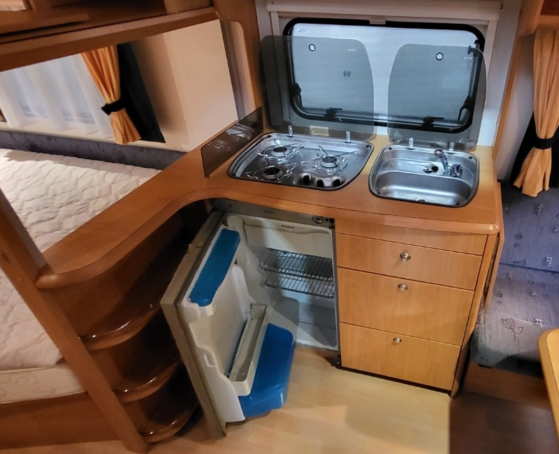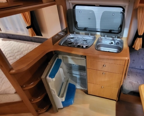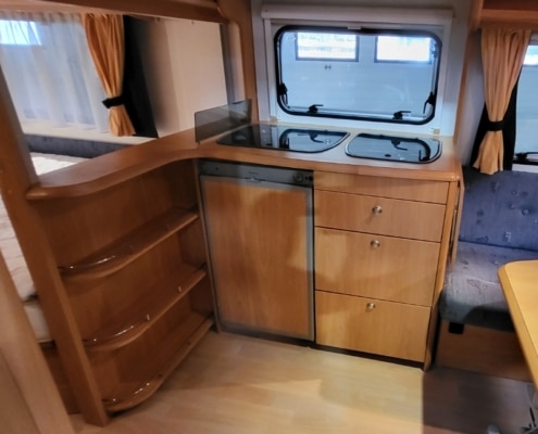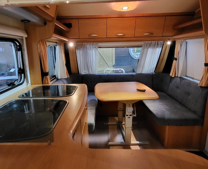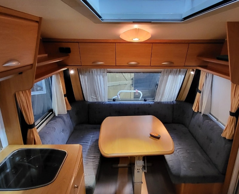 Deze caravan ziet er van binnen zeer netjes uit met sfeerverlichting en leeslampjes.