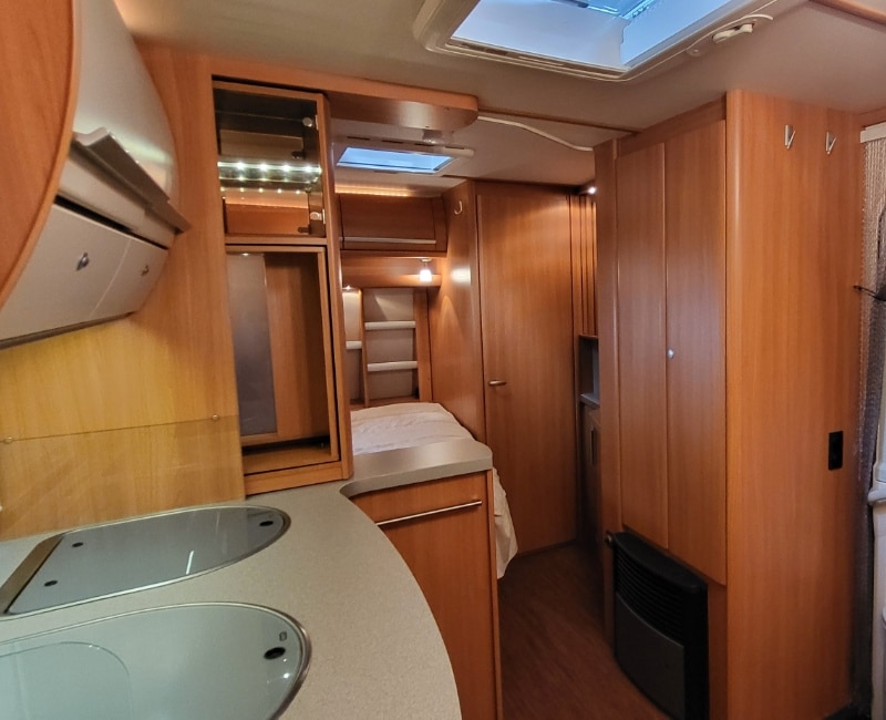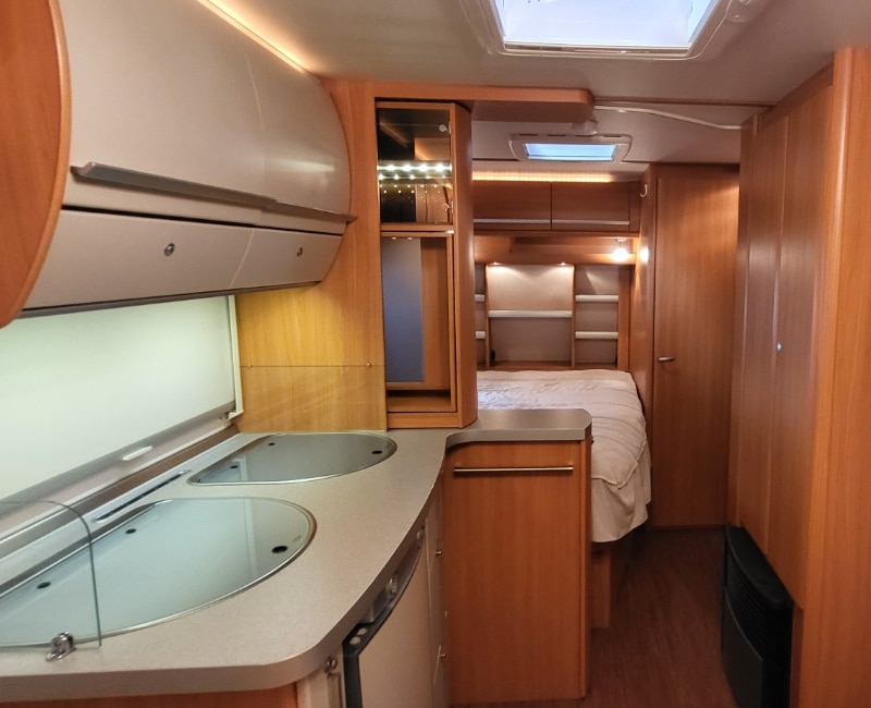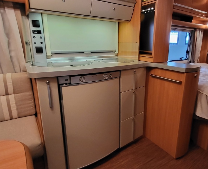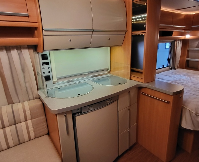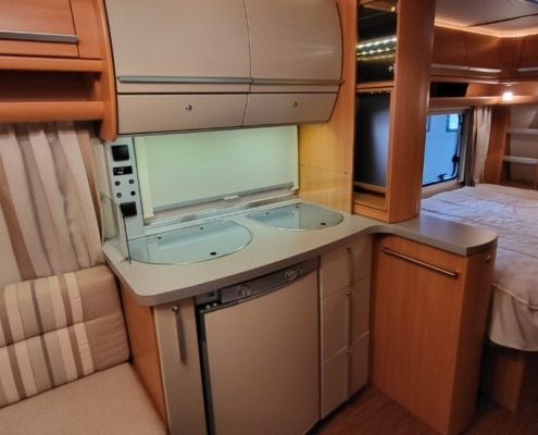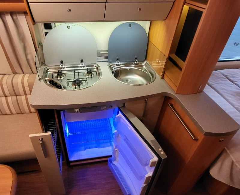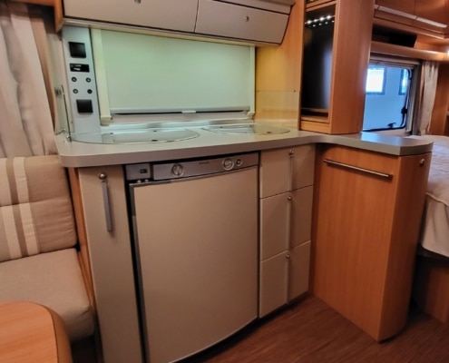 Keuken bevindt zich in het midden van de caravan en is voorzien van een koelkast met vriesvak en een apothekerskast. Spoelbak en een kookstel met 3-gaspitten is ook aanwezig.
