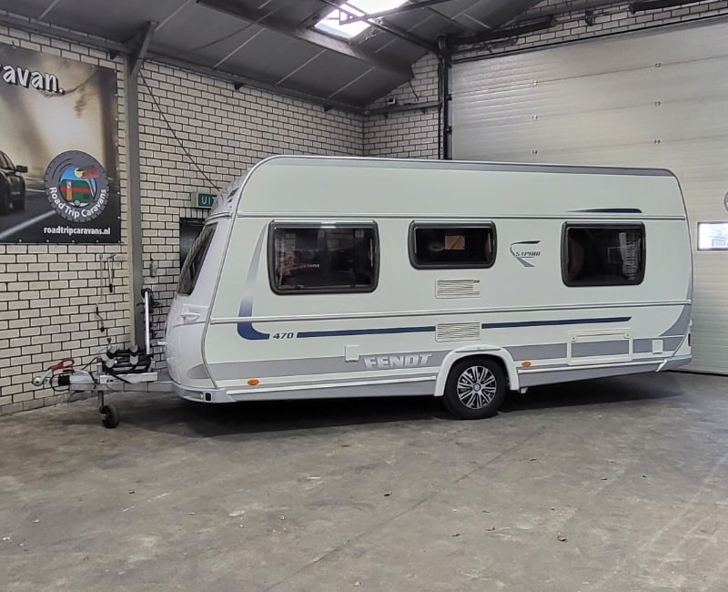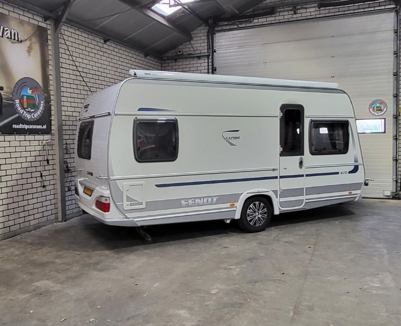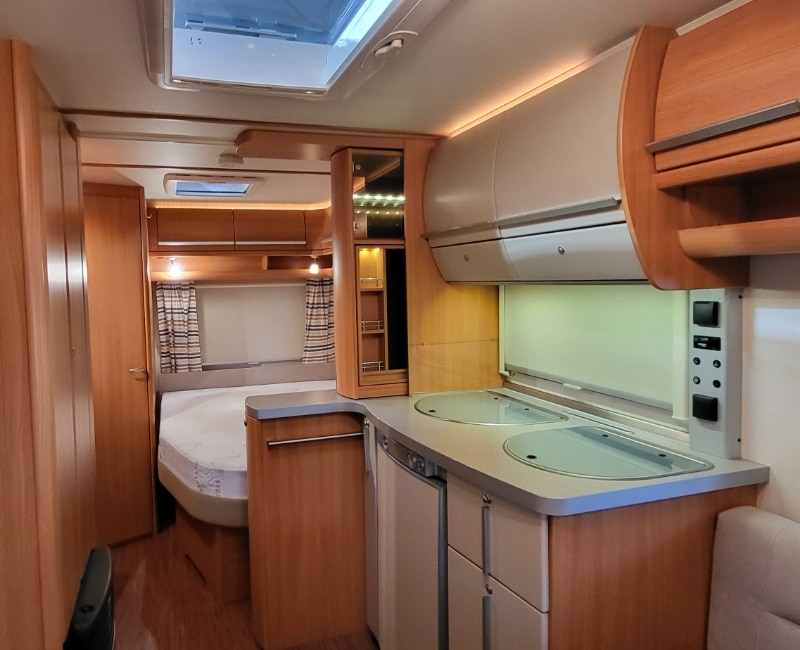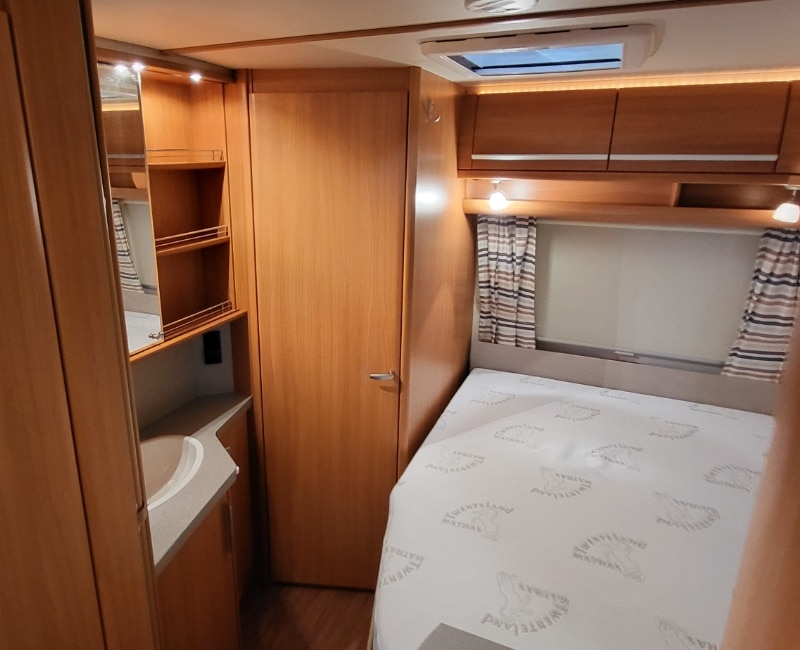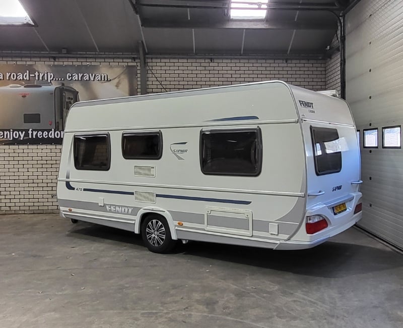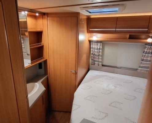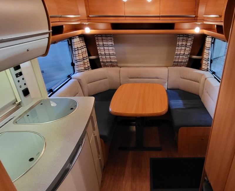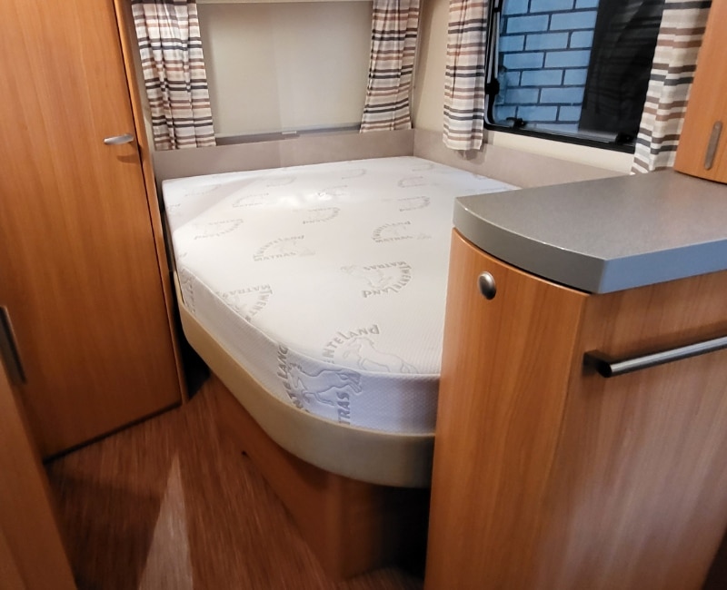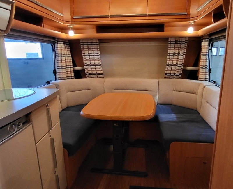 Caravan met een Frans bed en een rondzit.