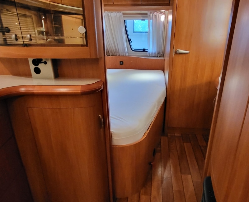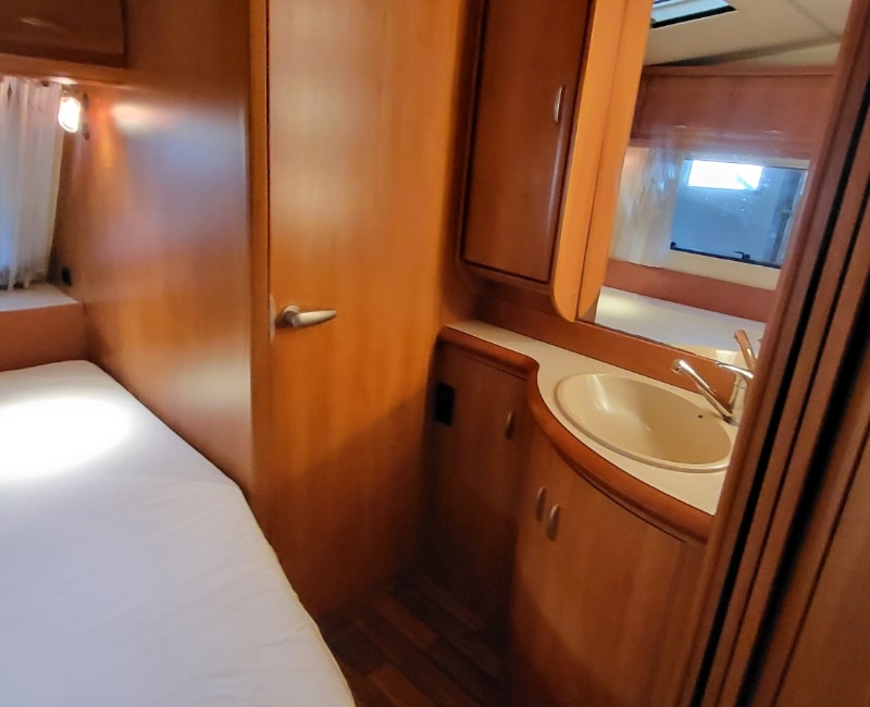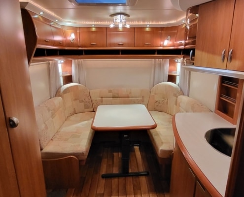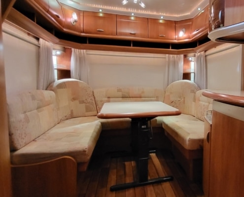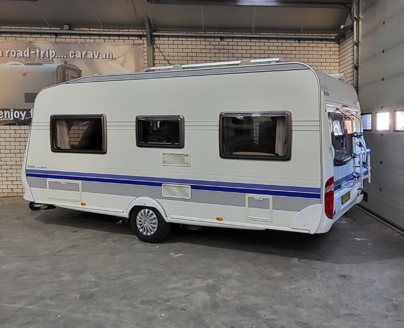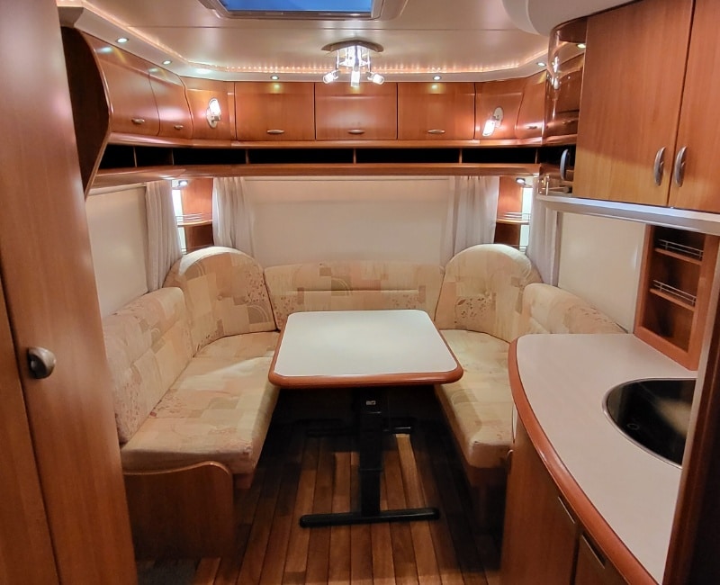 Mooie caravan met voorin een Frans bed en achterin bevindt zich een royale rondzit.