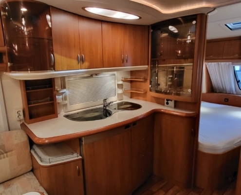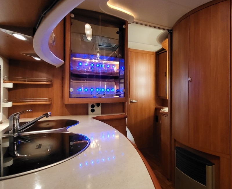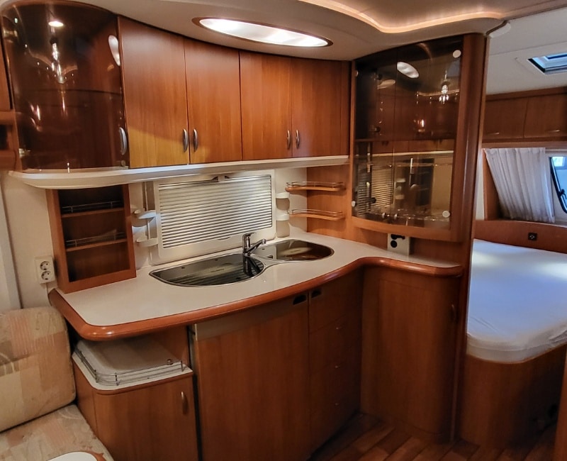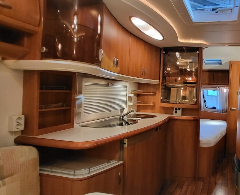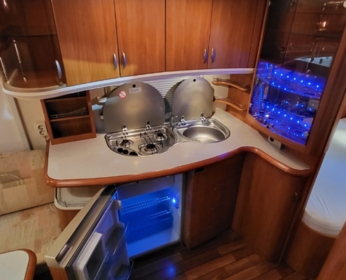 Keuken bevindt zich in het midden van de caravan en is voorzien van een koelkast met vriesvak en een apothekers kast. 3-pits gasstel en een spoelbak is ook aanwezig.
