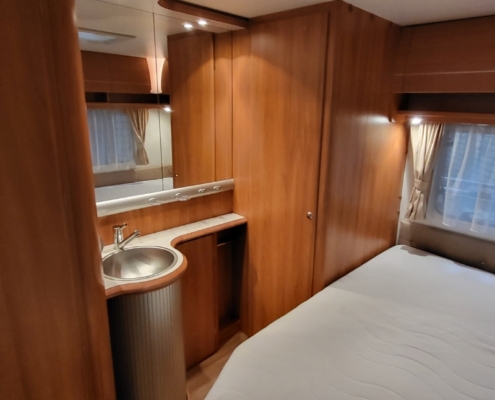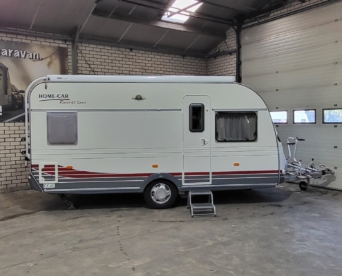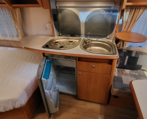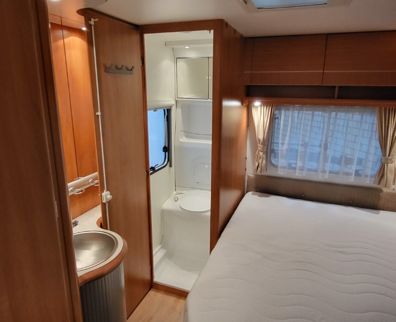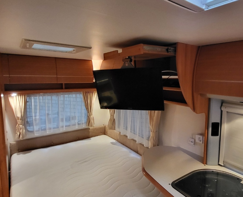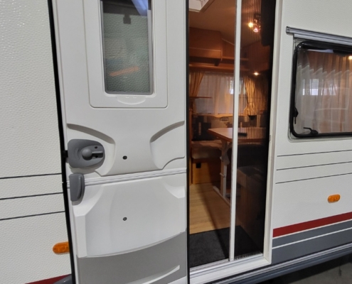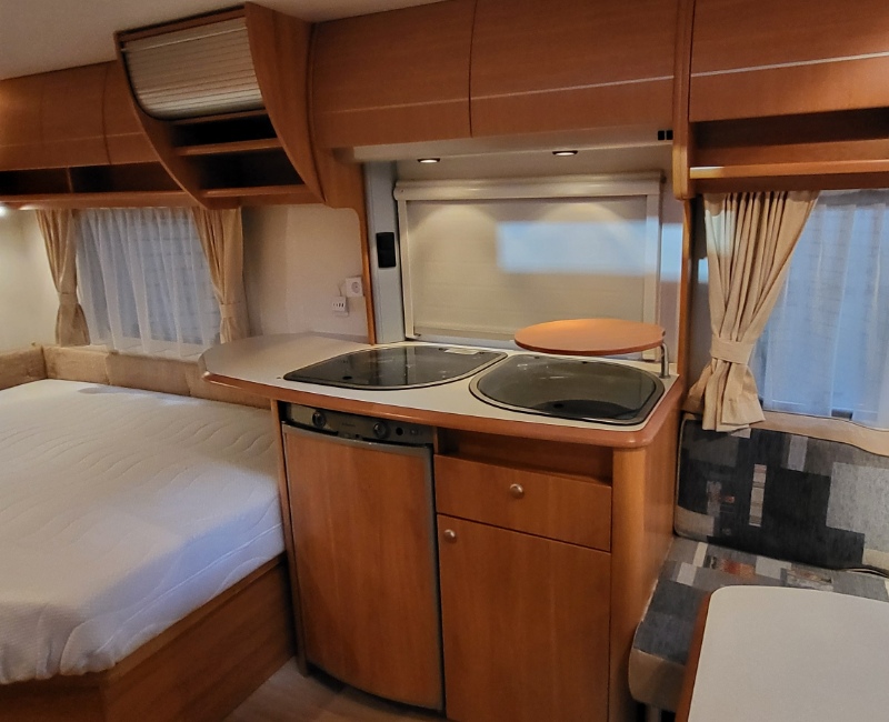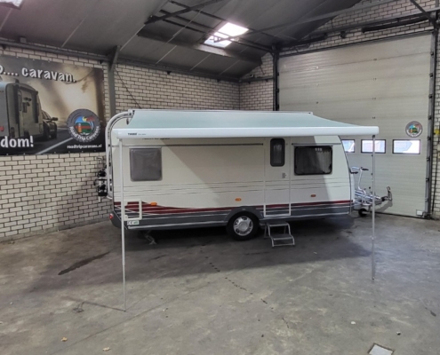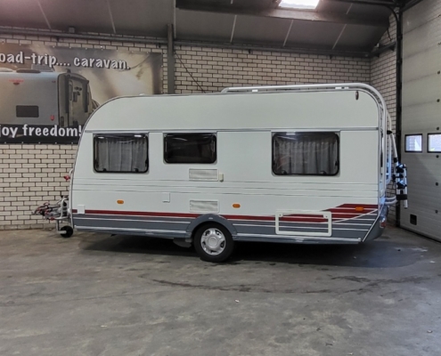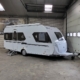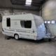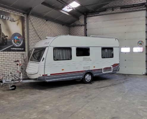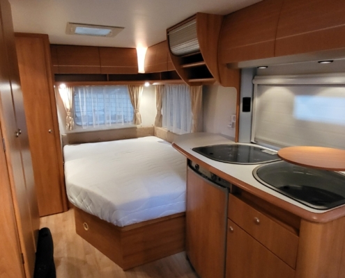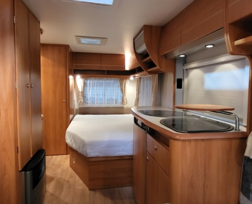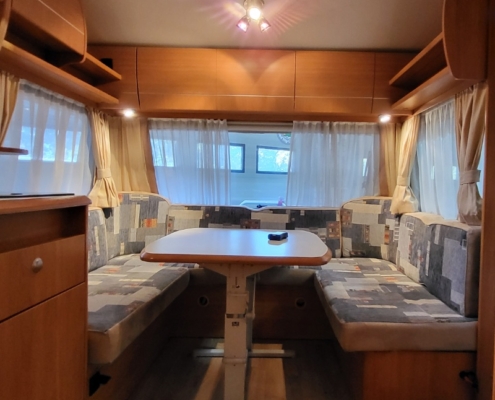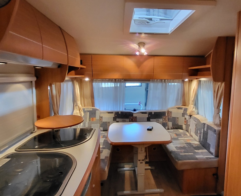 Mooie caravan met achterin een groot Frans bed (142 cm bij 212 cm) en voorin een rondzit.