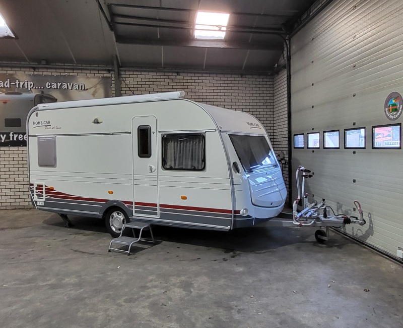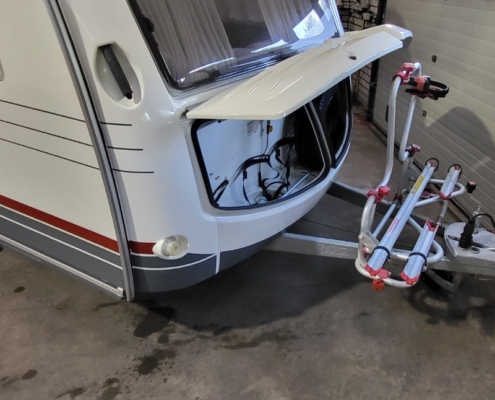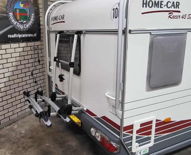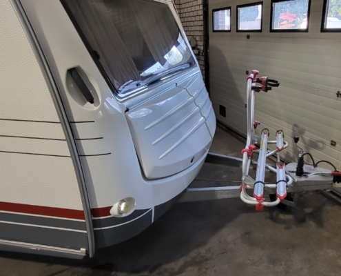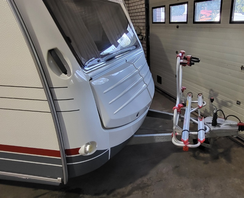 Voorop de dissel is een fietsendrager aanwezig net zoals achterop de caravan.