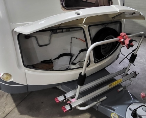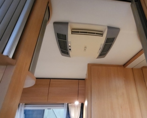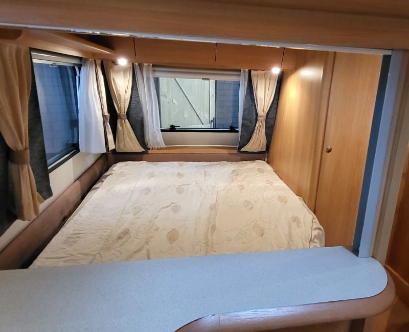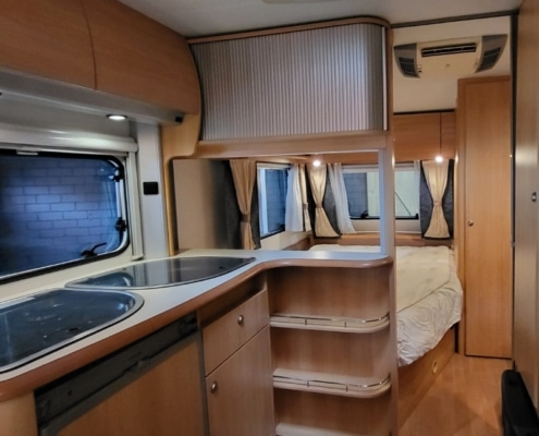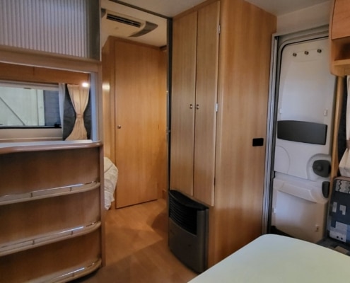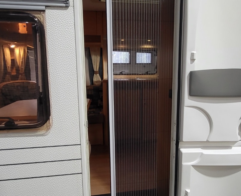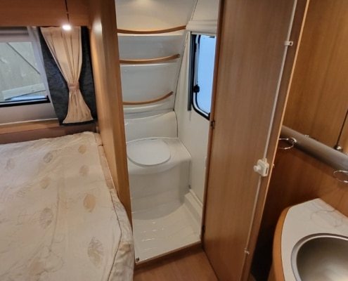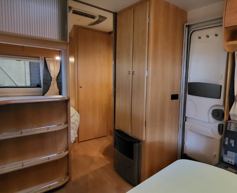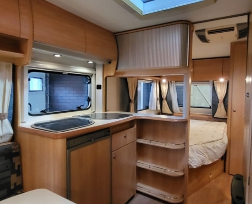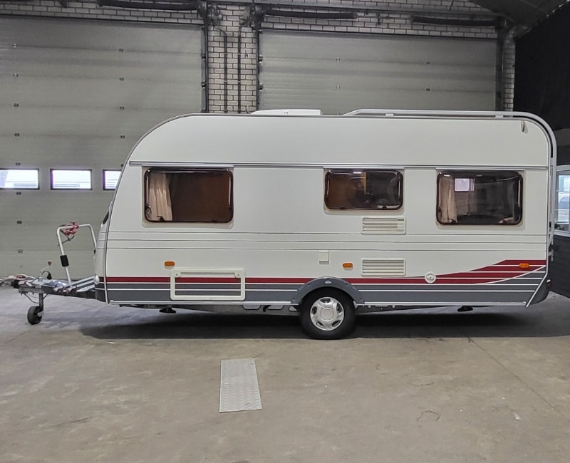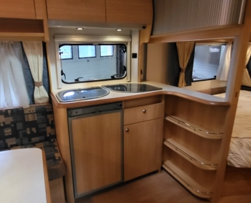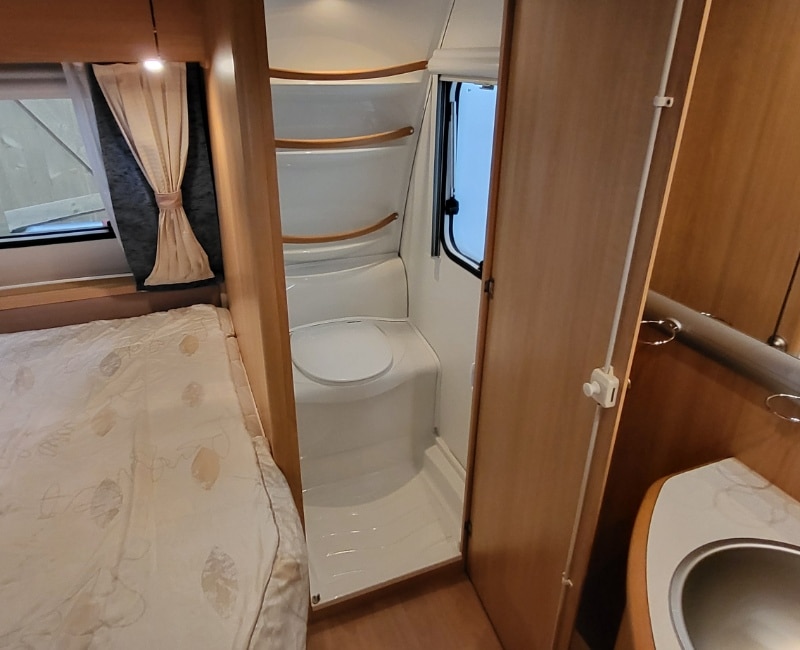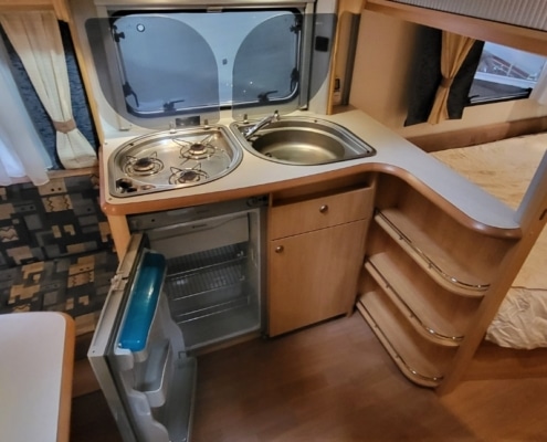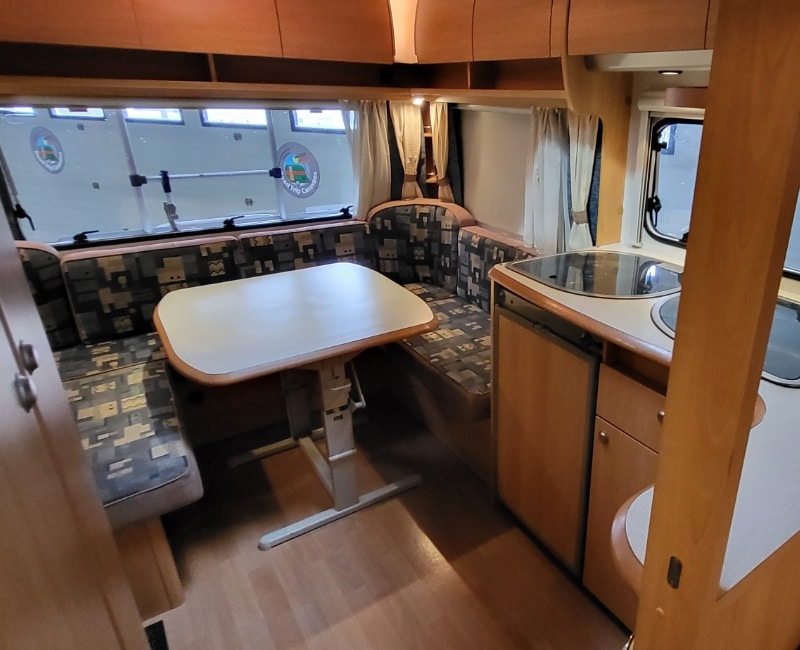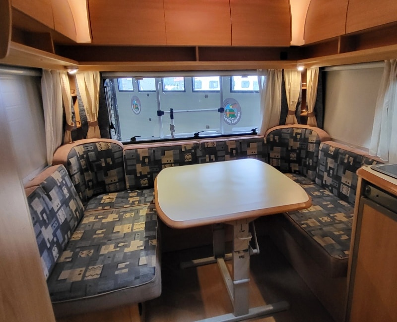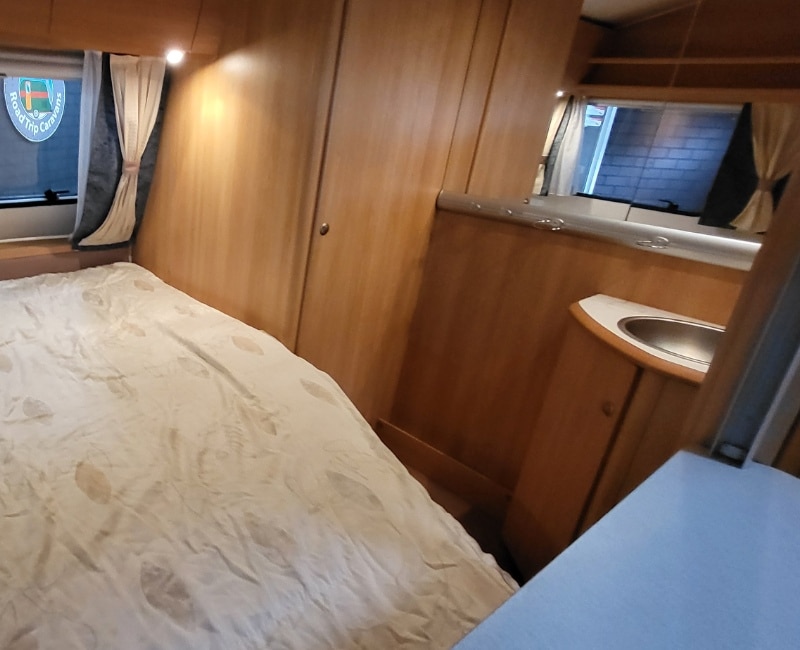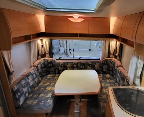 De indeling van deze caravan is een Frans bed voorin en een rond zit achterin. In het midden van de caravan bevindt zich de keuken en voorin een wasruimte en toiletruimte.