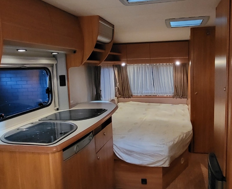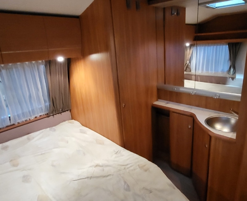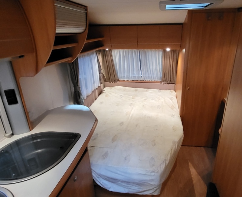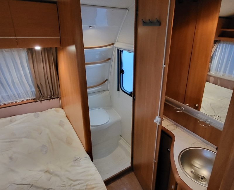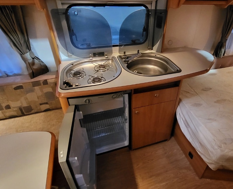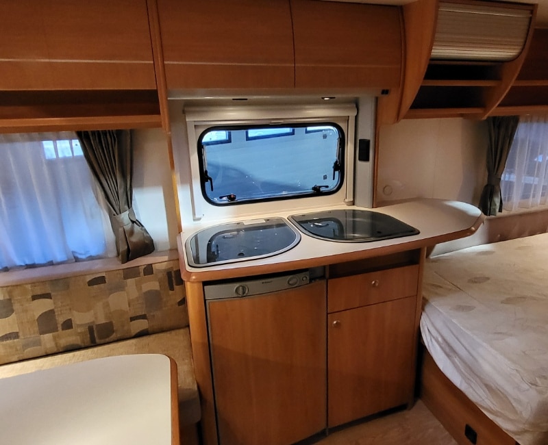 Keuken bevindt zich in het midden van de caravan en sanitair voorziening voorin.