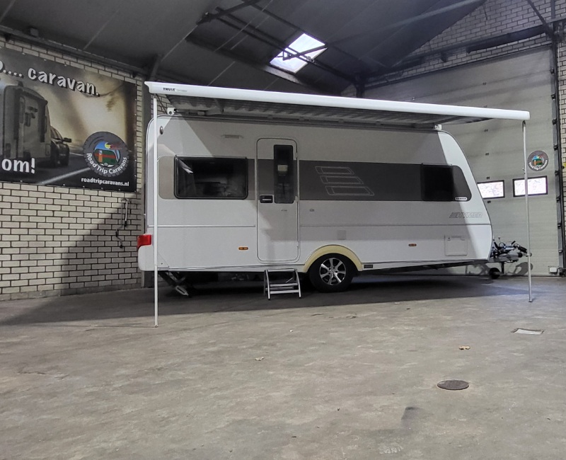 Deze Hymer caravan is inclusief een voortent van het merk Unico Genua 280 met een aluminium frame.
