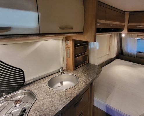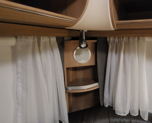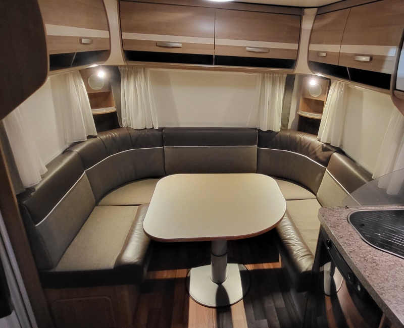 De indeling van deze caravan is zeer praktisch en bestaat uit een groot Frans bed (144 cm bij 200 cm) en een rondzit.