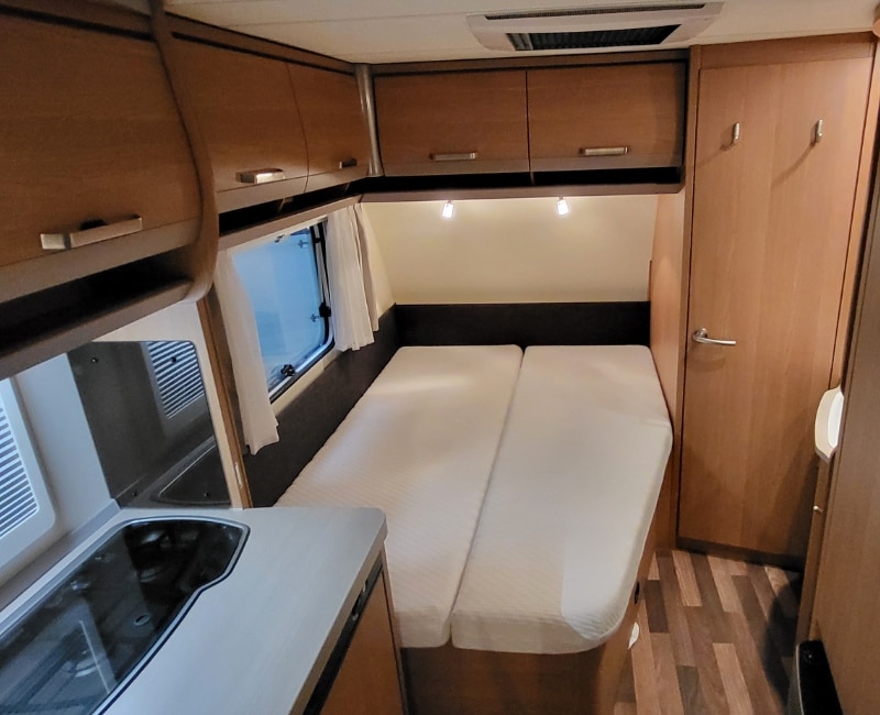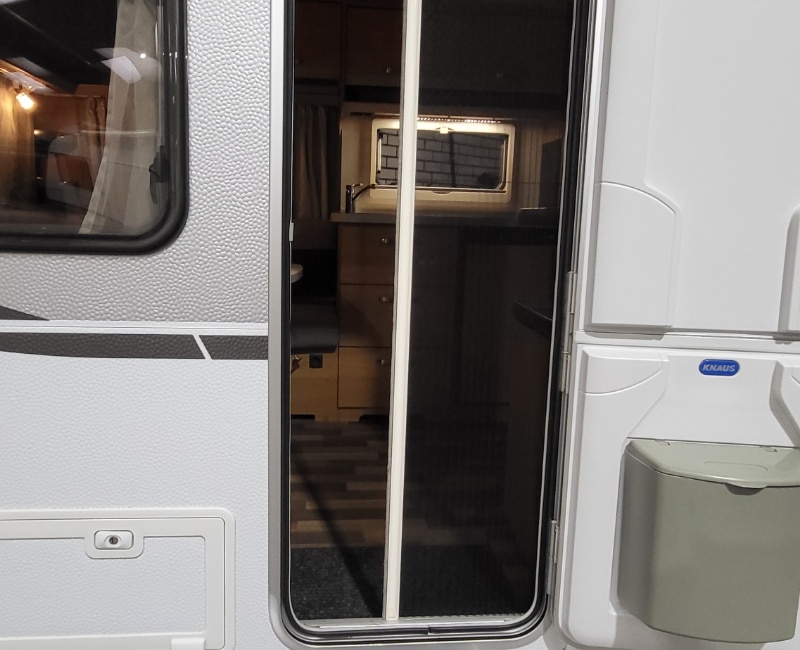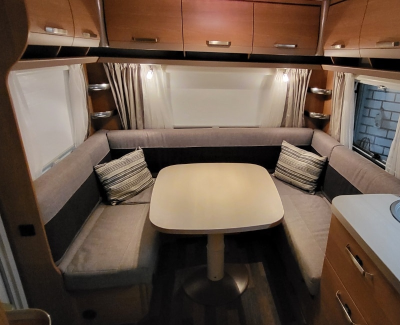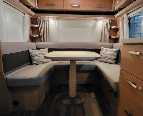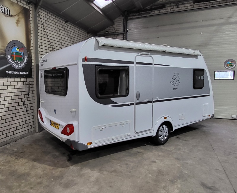 Deze Knaus Sport beschikt over een Frans bed en een mooie rondzit (Bekleding Active Rock).