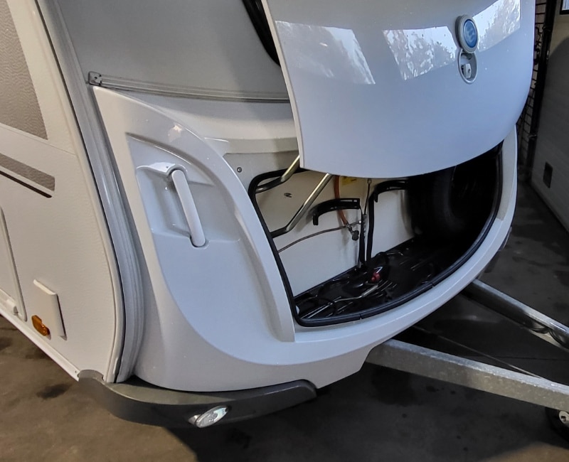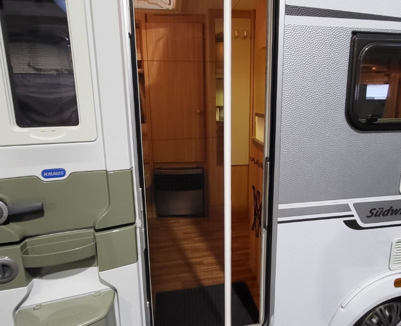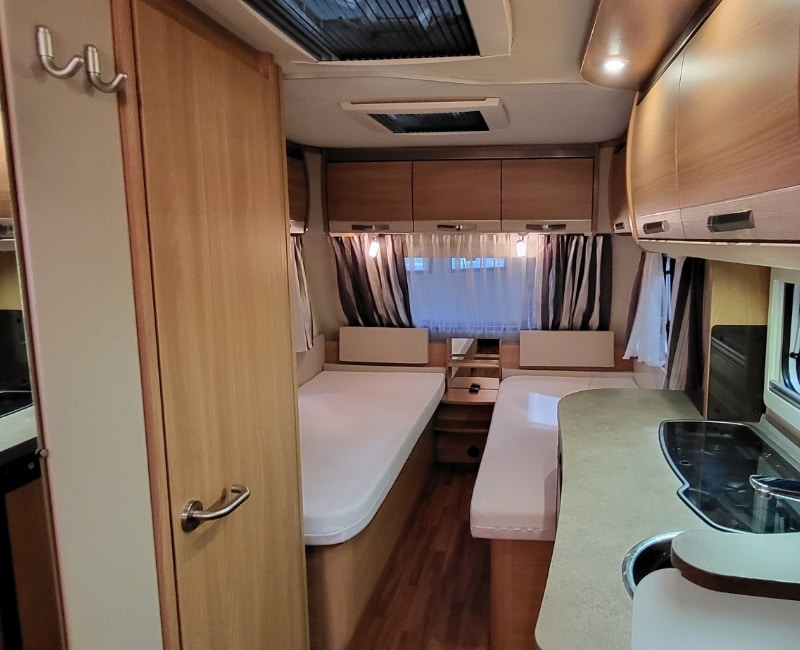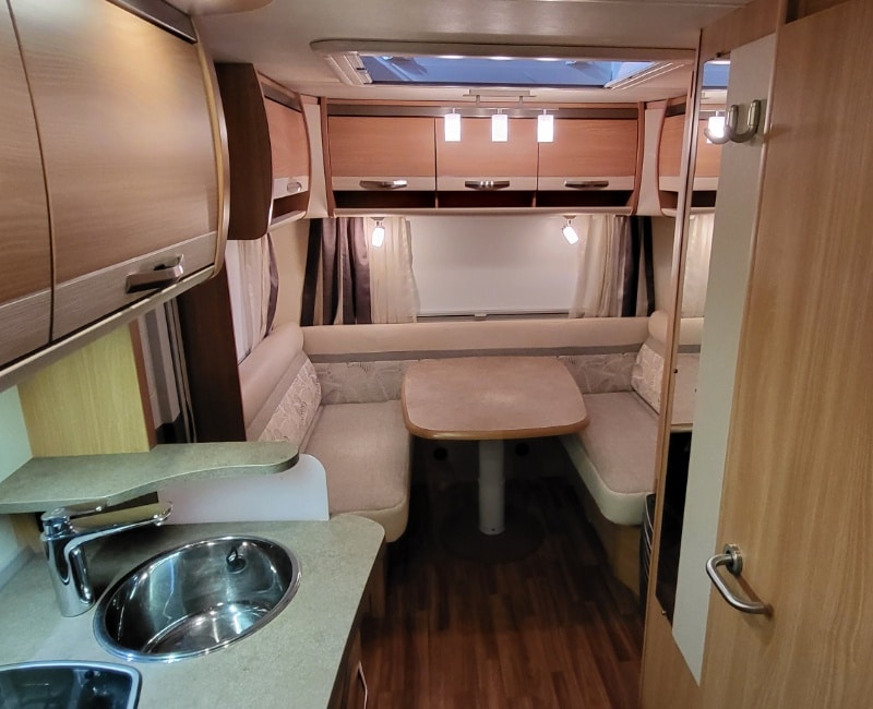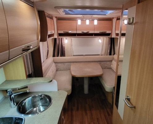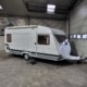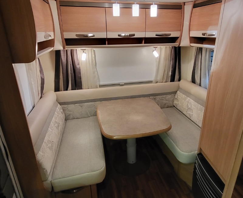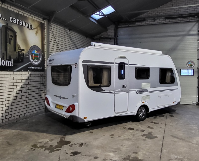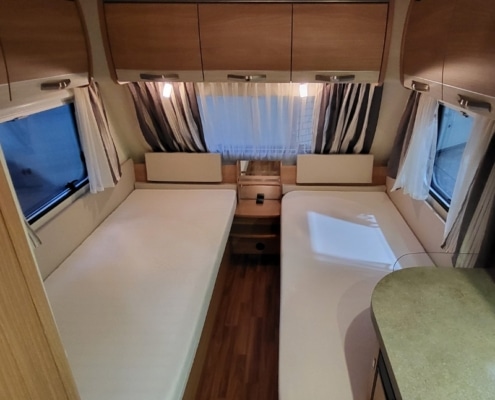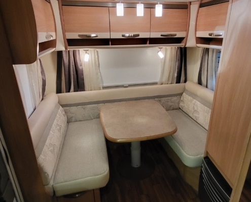 Deze Knaus caravan beschikt over enkele bedden en een mooie zitgedeelte.