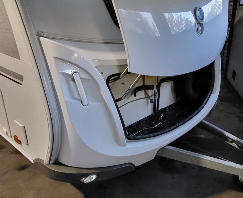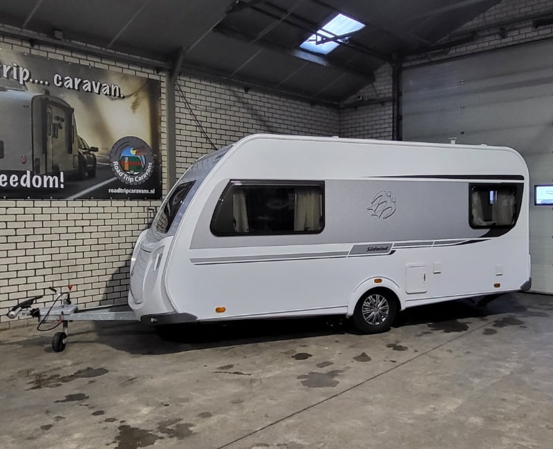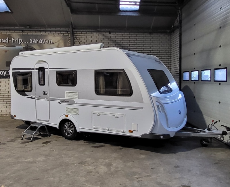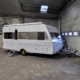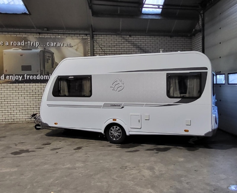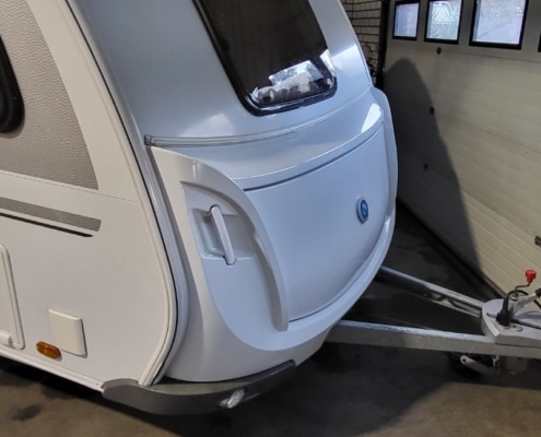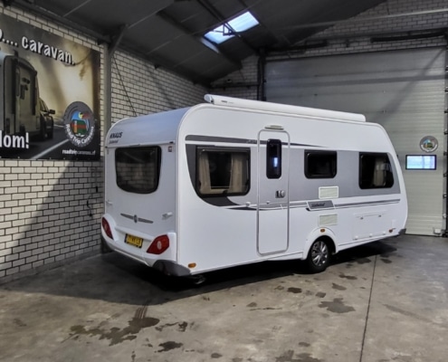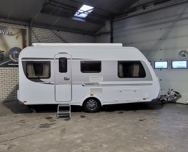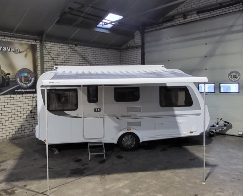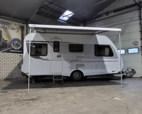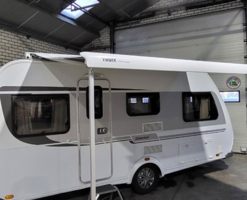 Caravan is voorzien van een mover (Go2) en een cassette luifel (Thule Omnistor) met een zijwand.