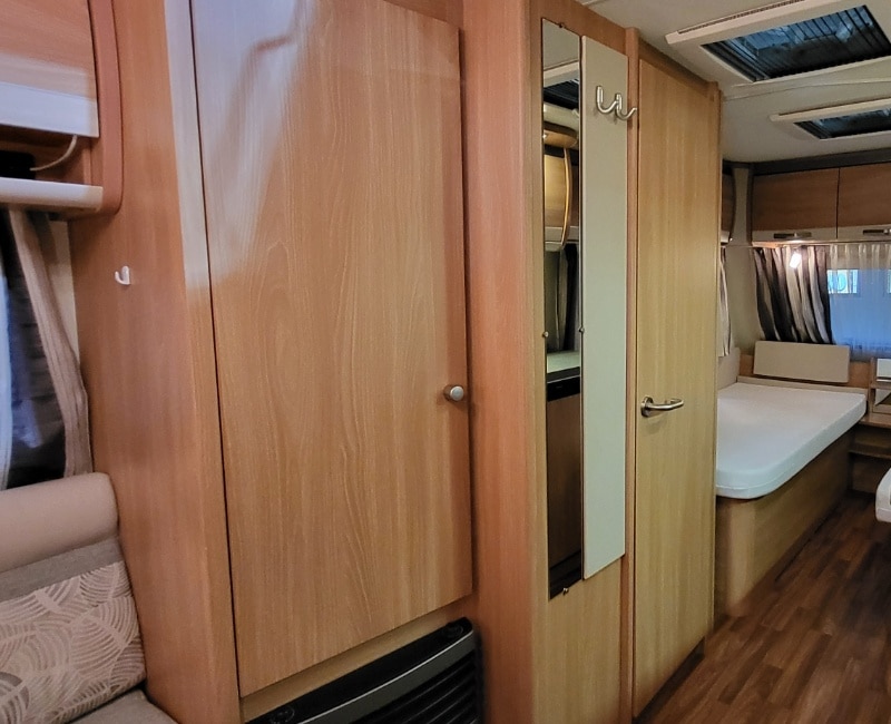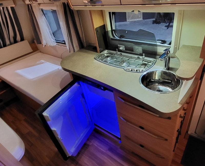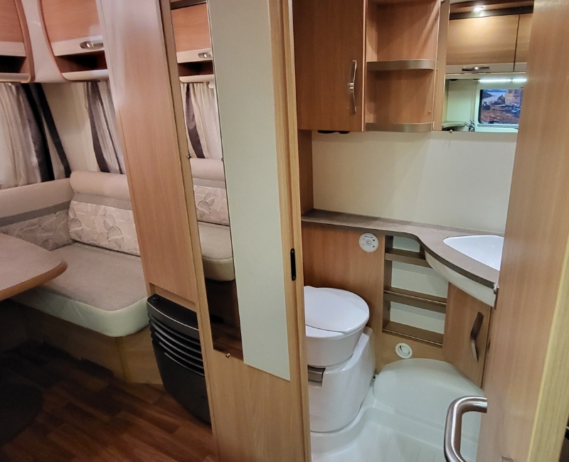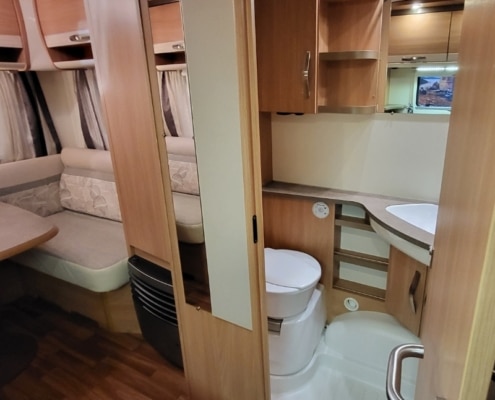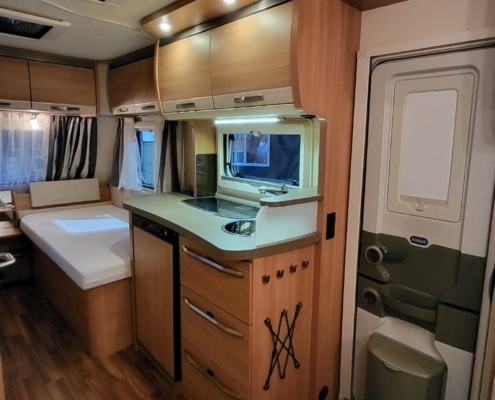 Keuken en toilet met wasruimte bevindt zich in het midden van de Caravan.