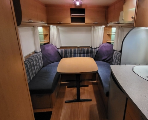 Deze caravan beschikt over een Frans bed en een rondzit.