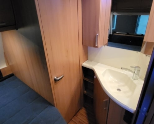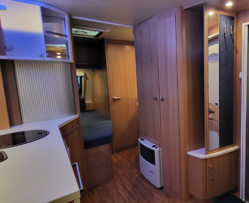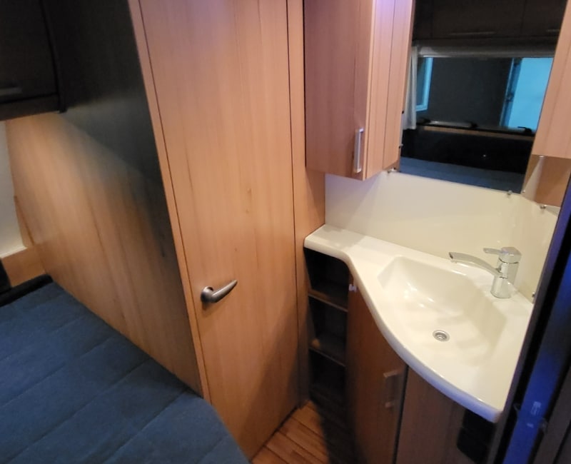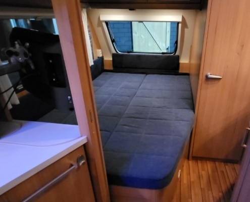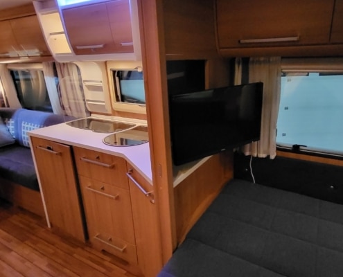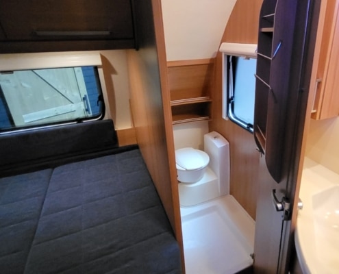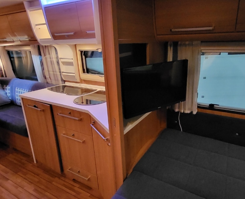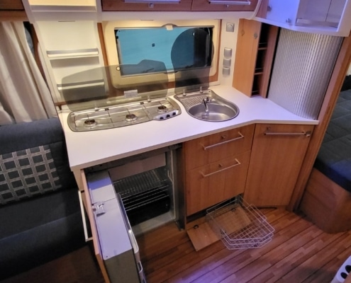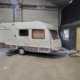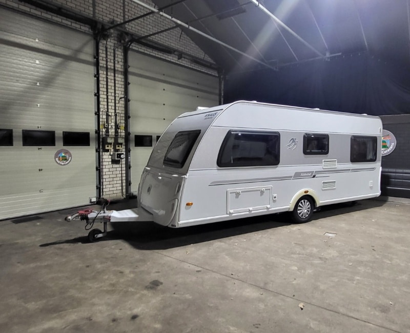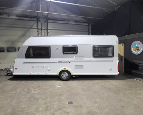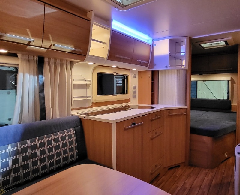 Mooie caravan met voorin een Frans bed en achterin een rondzit. In het midden van de caravan bevind zich een keuken en een grote kast gedeelte.
