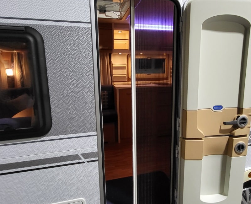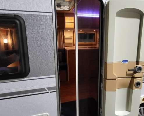 Plisse hordeur aanwezig en in de caravan is een vrij nieuwe televisie met draaibeugel aanwezig.