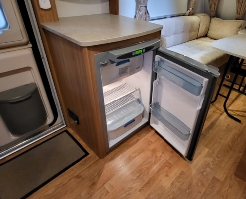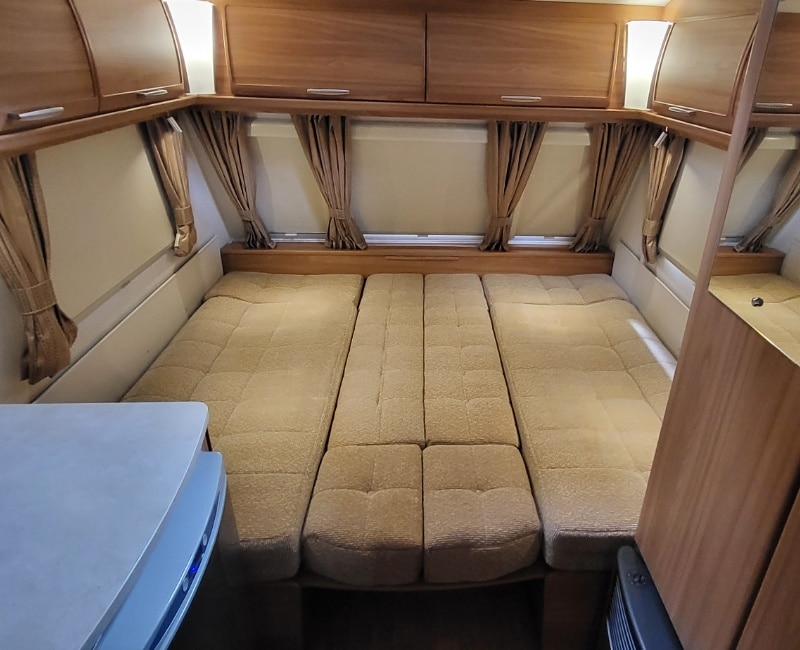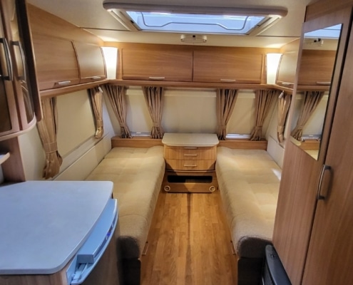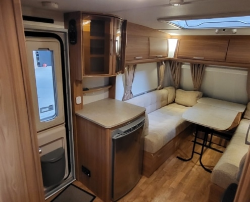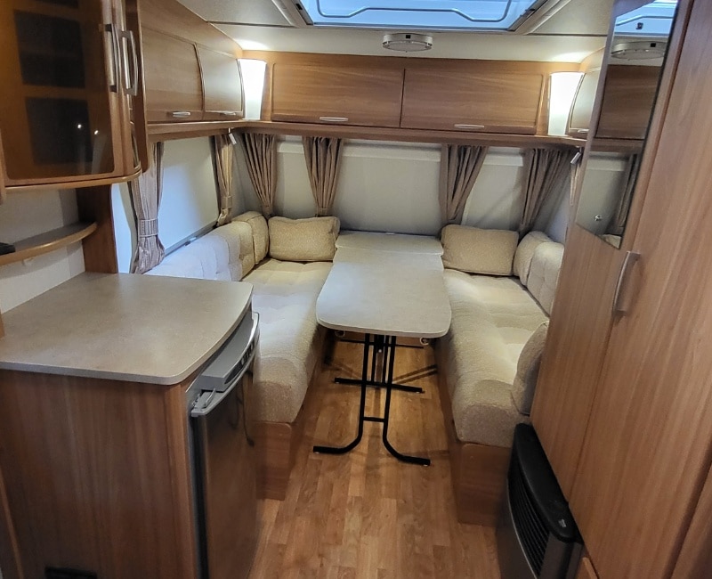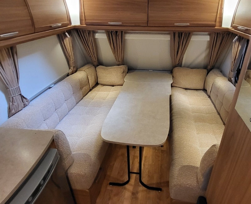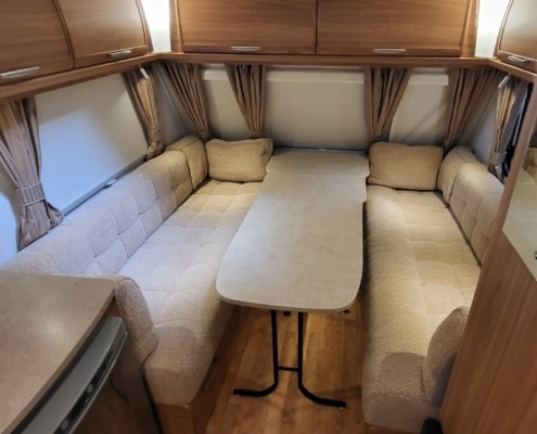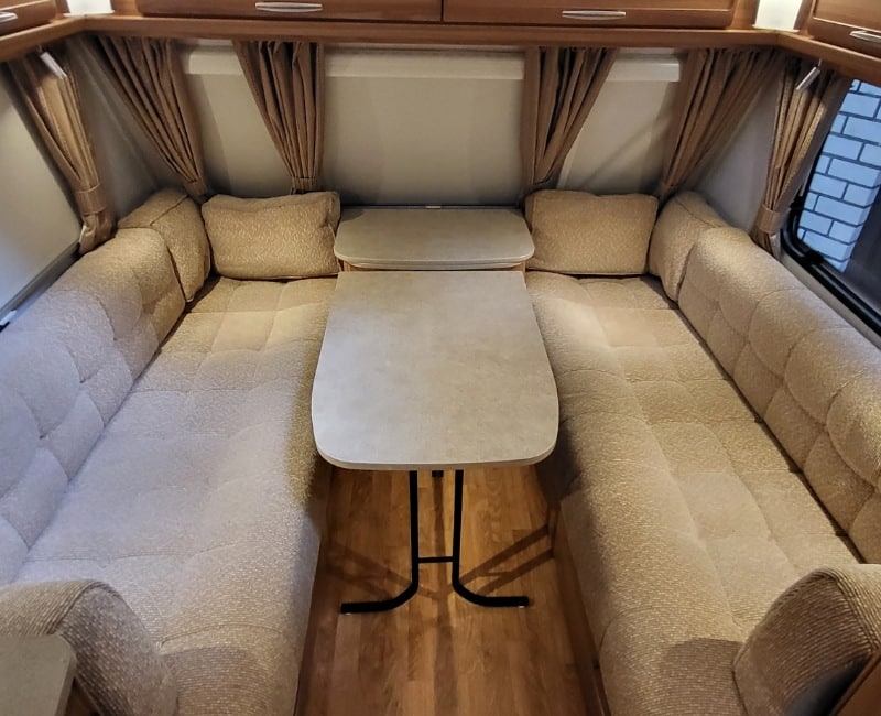 Deze caravan beschikt over een grote zitgedeelte met goeie comfort kussens en uitschuifbare/verlengbare tafel.