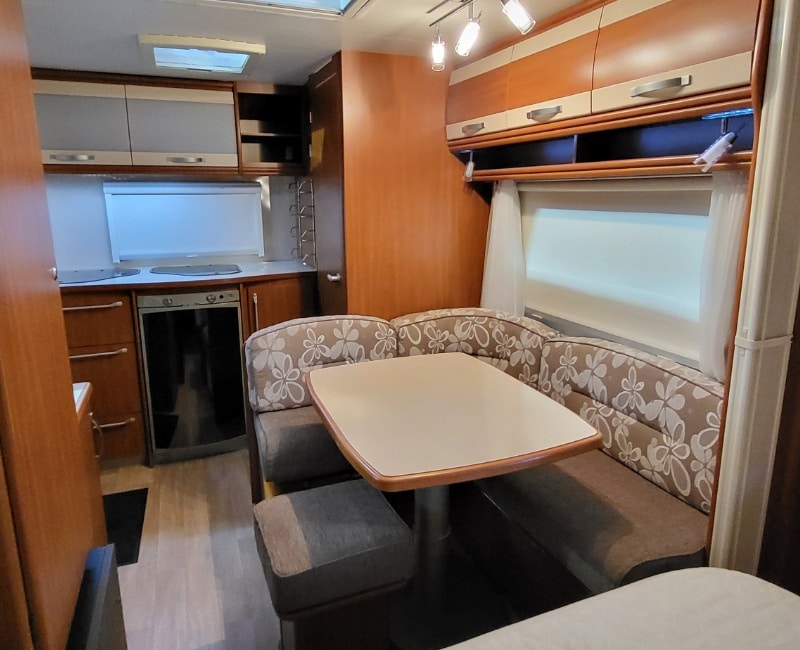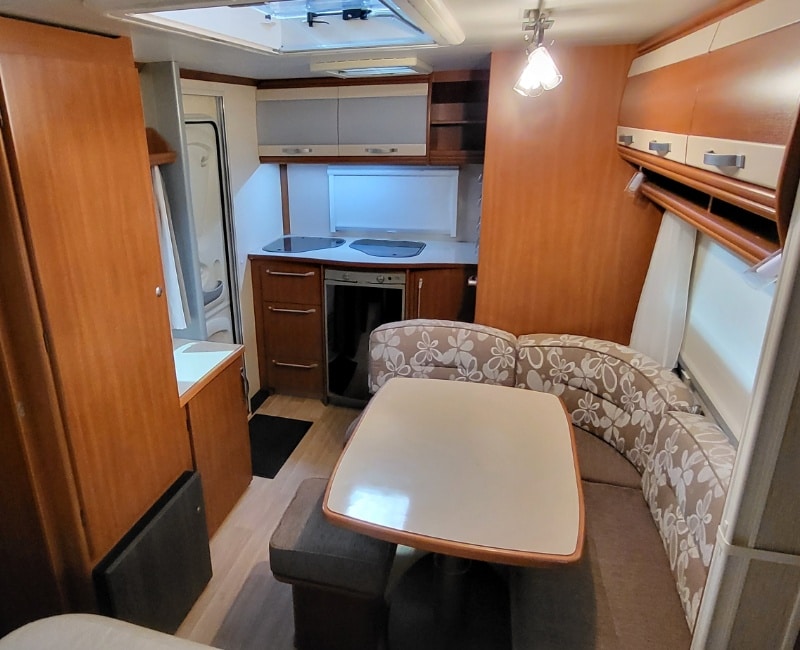 De indeling van deze caravan bestaat uit een keuken en sanitair/toilet gedeelte achterin de caravan bij binnenkomst en in het midden van de caravan een mooie zitgedeelte met een losse poef.