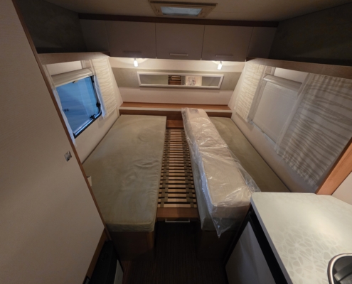 Je kunt van de enkele bedden een groot bed maken doormiddel van een uitschuifbare lattenbodem (Tussen matras is aanwezig).