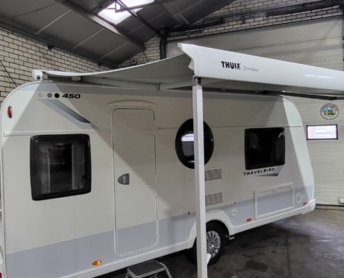 Caravan is voorzien van een cassette luifel met 1 zijwand van het merk Thule en er is ook een voortent aanwezig van het merk Dorema TenCate (Antraciet).